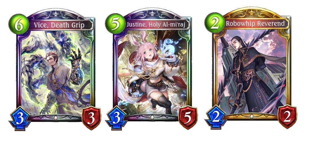 Vice, Death Grip is one of the strongest cards in the game in terms of card advantage because of its fanfare of giving you 2 0 cost Ironknuckle Nuns making it a +3. If Limonia’s evolve skill is active he becomes a +5. Vice can take control of the board with his other skill that gives allied machina followers +2/-2 and rush when played. You can also keep the 0 cost Ironknuckle Nuns on later turns to create a huge board with Elana and/or Robowhip.