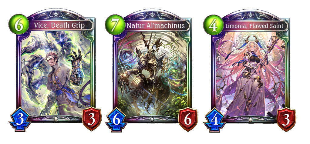 Vice, Death Grip is the usual 2 0 cost Ironknuckle Nuns. Natur Al’machinus is every class’ Daria that reduce the cost of machina and natura followers drawn by him by 3. Limonia, Flawed Saint when evolved gains leader an effect that gives a 0 cost Salvation Ex Limonia spells for every machina follower destroyed which can reduce cost of cards by 1 and can give Heavenly Aegis when used more than 4 times. Cost Reduction is very important to consistently create big boards every game.